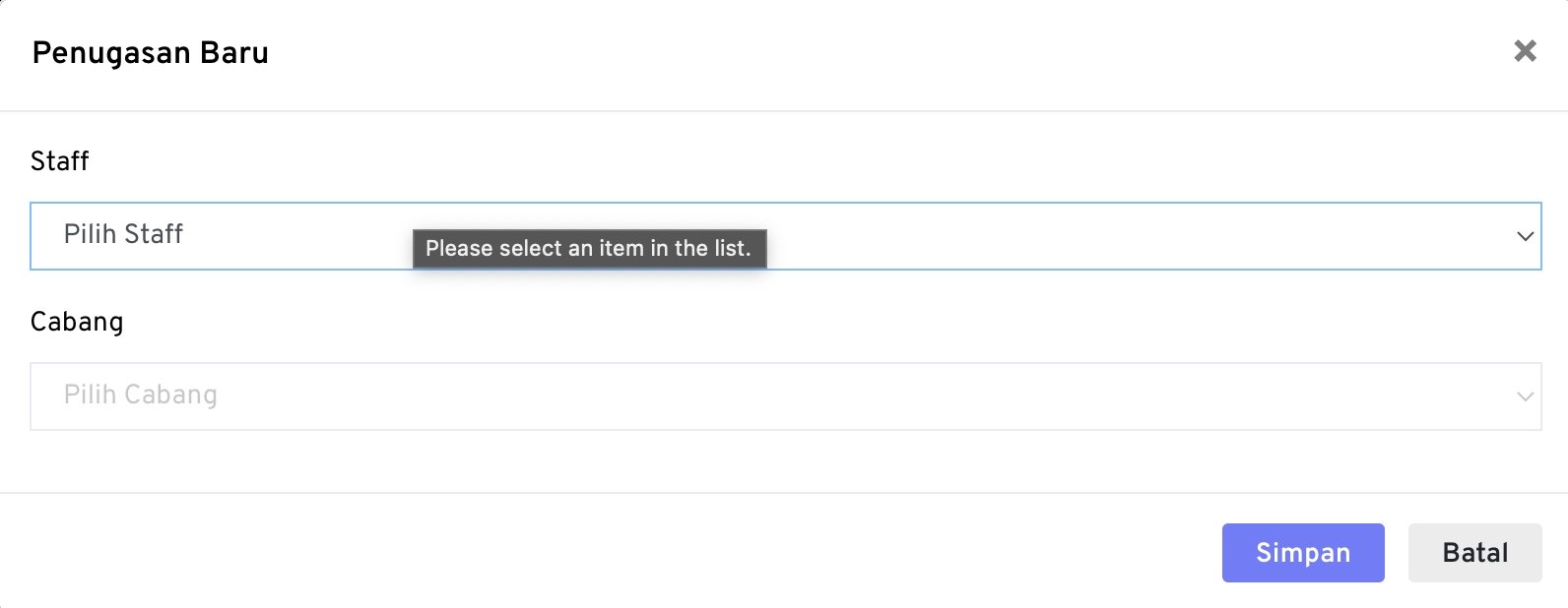 Pastikan Anda telah logged in dan memiliki akses untuk menambahkan staff sebagai kasir pada cabang tertentu